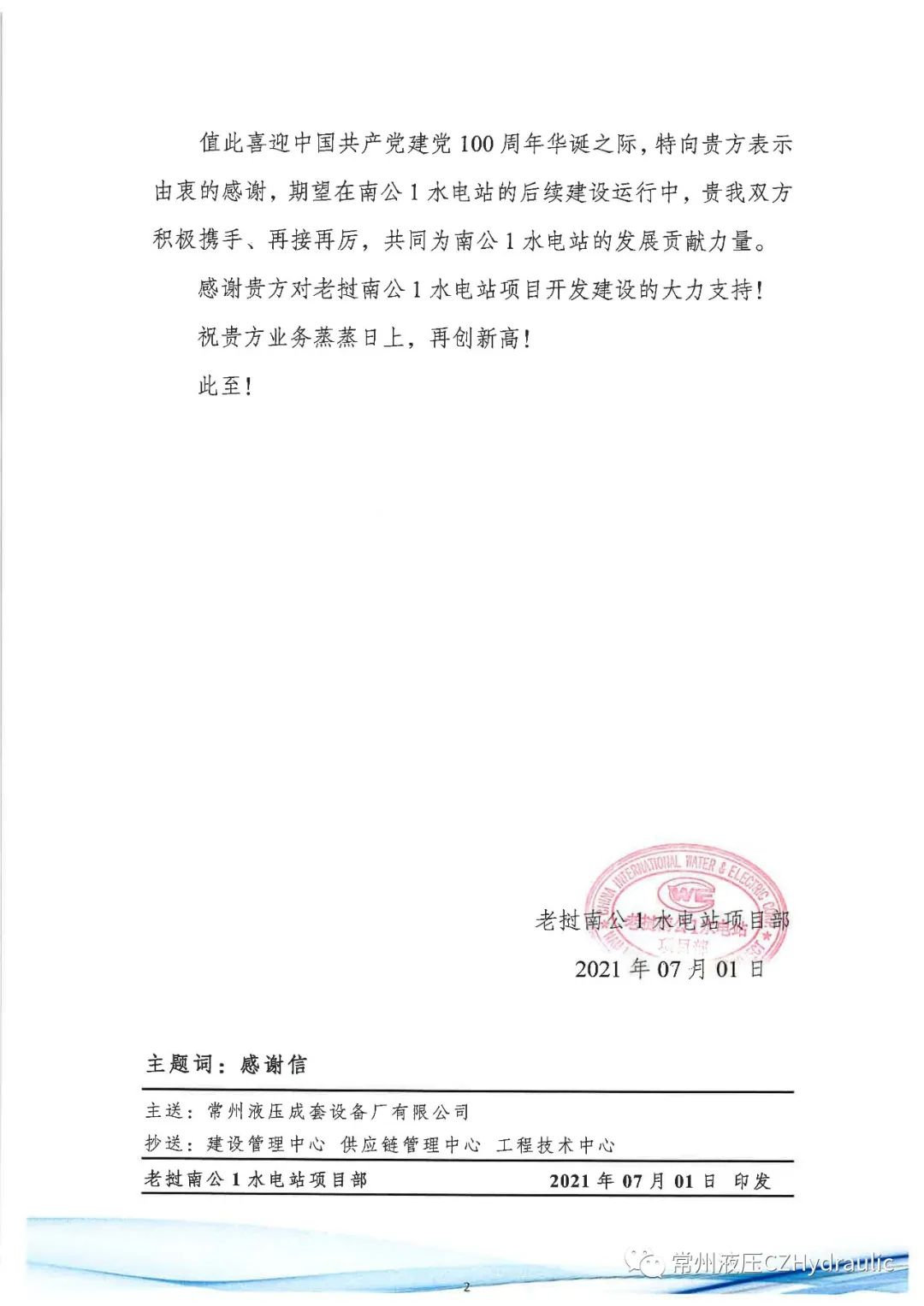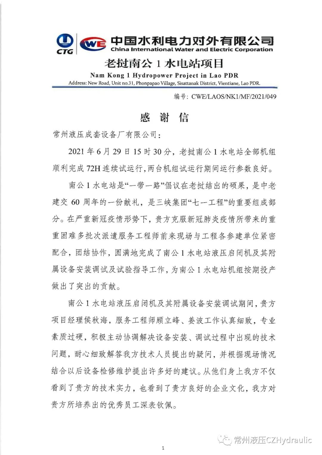 喜迎中國共產黨建黨100周年華誕之際,老撾南公1水電站項目部發(fā)來感謝信,感謝常州液壓在疫情防控期間克服重重困難派遣服務工程師指導南公1水電站液壓啟閉機及其附屬設備安裝調試工作,項目經理積極協(xié)調解決現(xiàn)場問題,保障了南公1水電站機組按期投產發(fā)電!